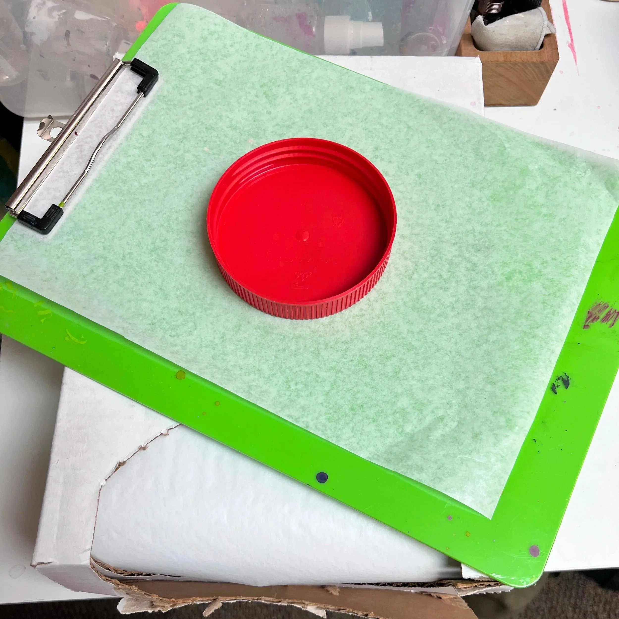 A palette is the place you put your blobs of paint while you are painting.  I have tried lots of different types from ones you purchase to old yogurt lids or glass panels.  My current favorite is a clipboard with a piece of scale paper clipped to it.  You can buy a whole box of 2000 sheets of scale paper at restaurant supply shops or online and it will likely last you a lifetime.  When I am done I either throw it out or save it for making mixed media art.