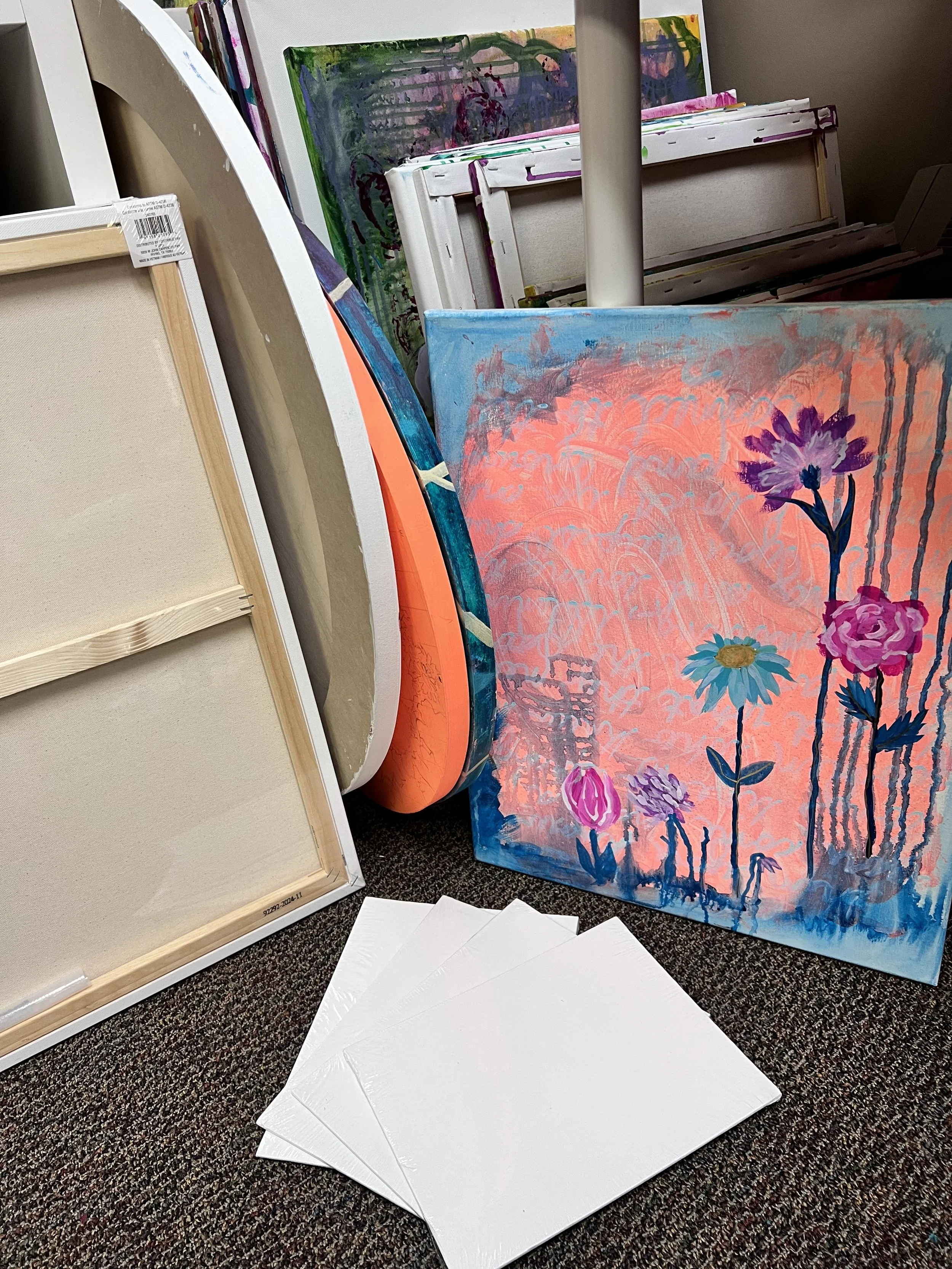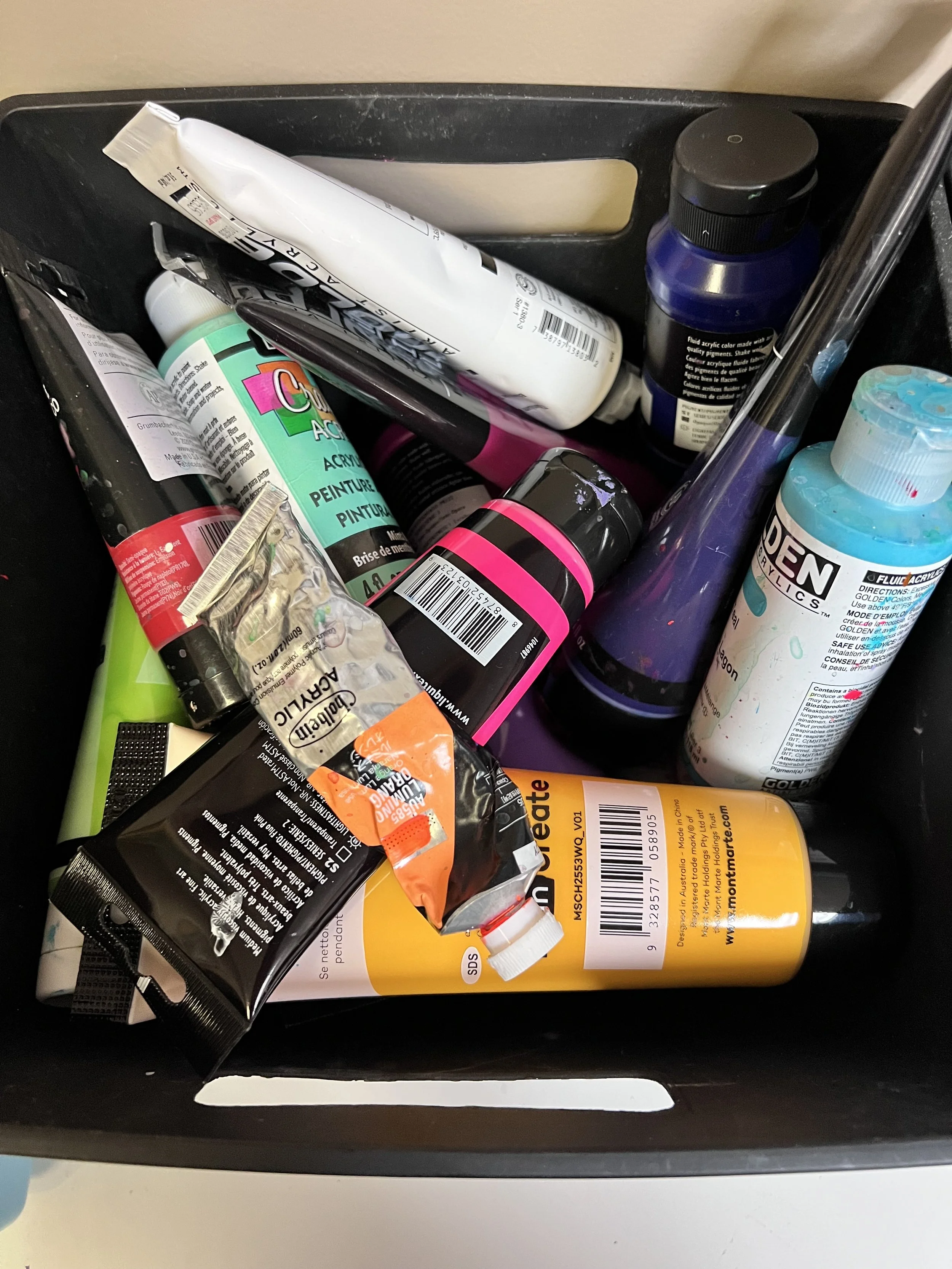 I use student grade acrylic paints in my studio classes, and professional grade paints for my personal paintings.  I recommend using what you feel comfortable with.  Low cost paints generally have less pigment and a more jelly texture so don’t expect them to give you the same intense colors and smooth application as more quality paints.  If you are new to acrylics I encourage you to get curious and buy a variety of small tubes that fit your budget!  I have experimented with dollar store paint and some colors work great.
