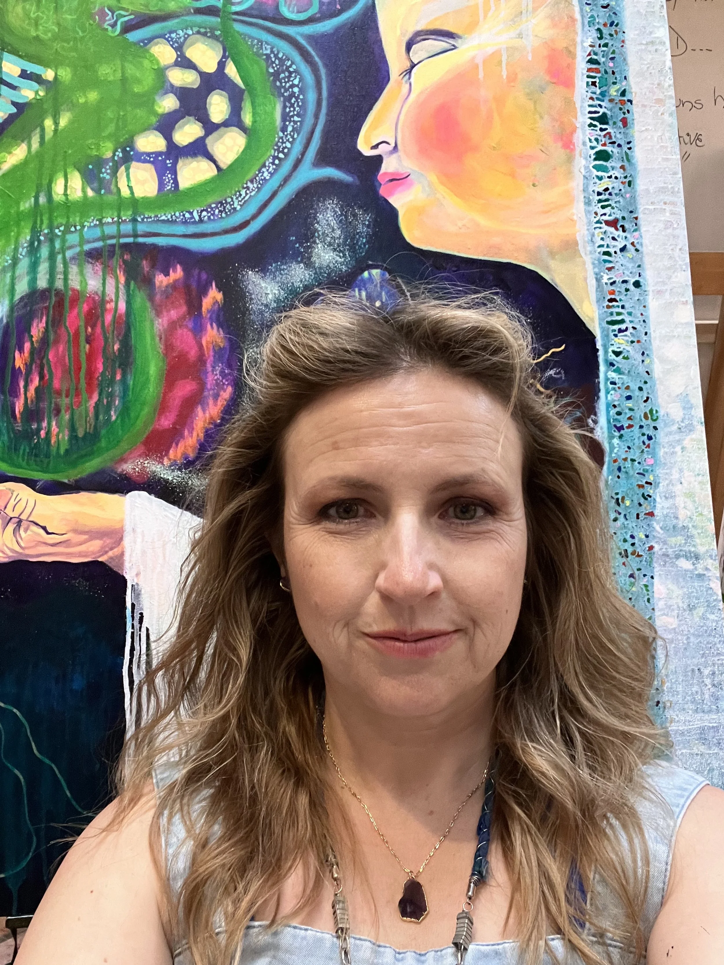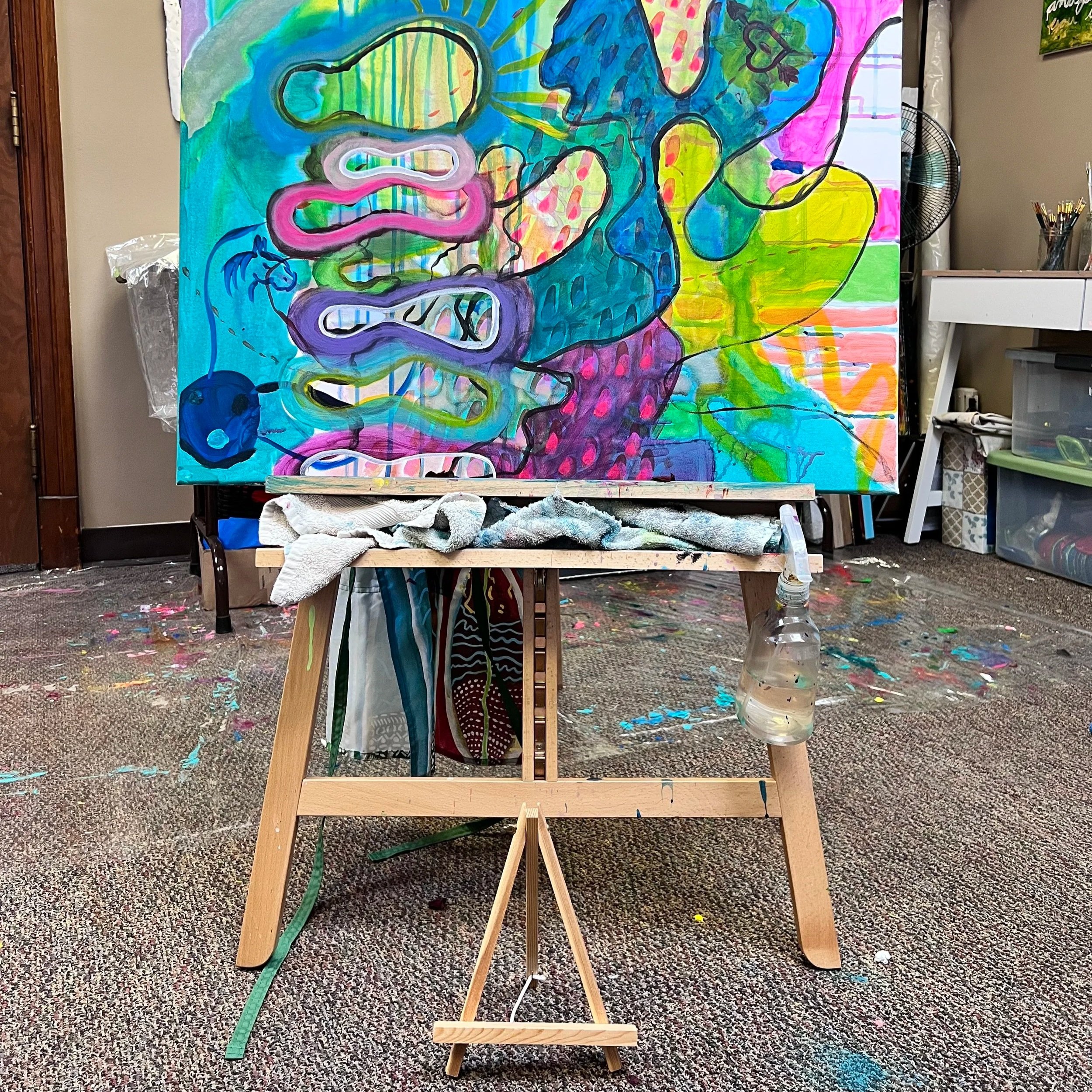 In the fall of 2023 I had this sudden calling to take a painting I was working on out to a yurt in the forest. I had never done anything like this before, but I had been saying yes to a lot of new things since leaving my teaching job of 20 years due to burnout. While I was there, alone in the forest, I painted and wrote and observed my painting, and as I spent time moving between each of these creative acts the messages from the painting began to reveal themselves.
