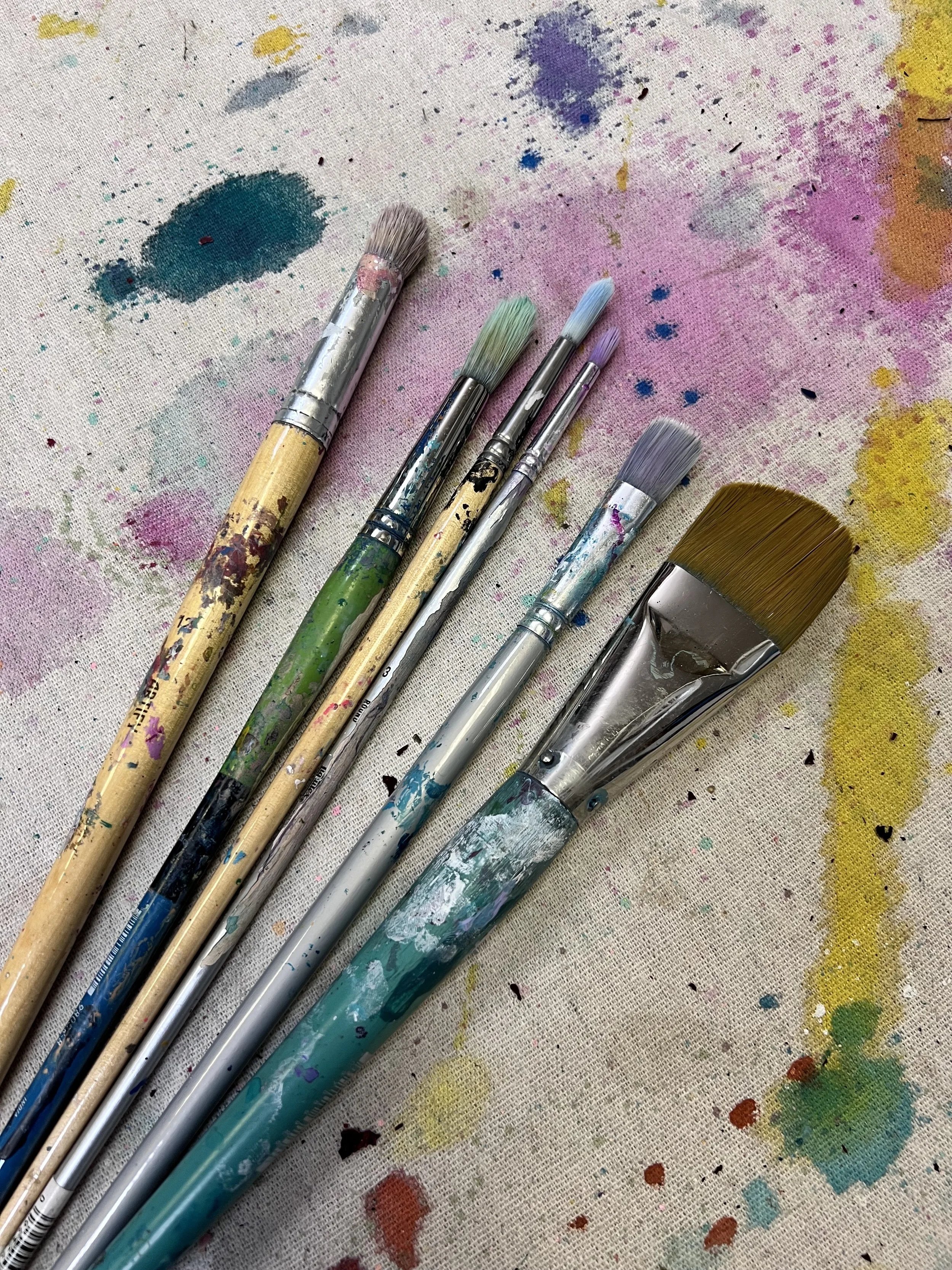 In intuitive painting, any and all brushes are great!  I like to have a “pointy” brush, that acts kind of like a pencil, for making wandering lines.  For filling in and covering large areas with paint, a flat brush works great: I call this my “painting the fence” brush.  A coarse, horse hair brush comes in handy for flicking star dust.  In our community we also love a big, fat brush for making bold marks!  I mainly use student grade brushes in all my work because I treat them rough!